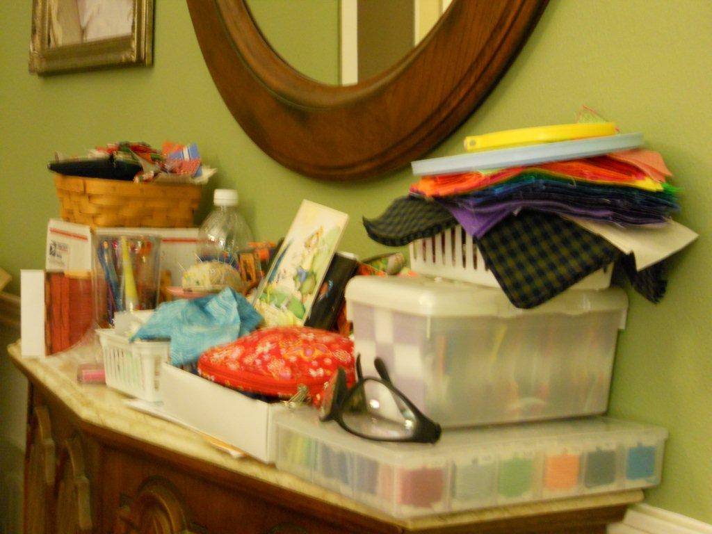 Here's something I started using - a baby wipe tub with the lid off to use as a table top trash can for trimmings and such. :) kinda like a trash bowl for when you're cooking. Also, I love my handly little nail brush to keep my cutting mat nice and clean from threads.