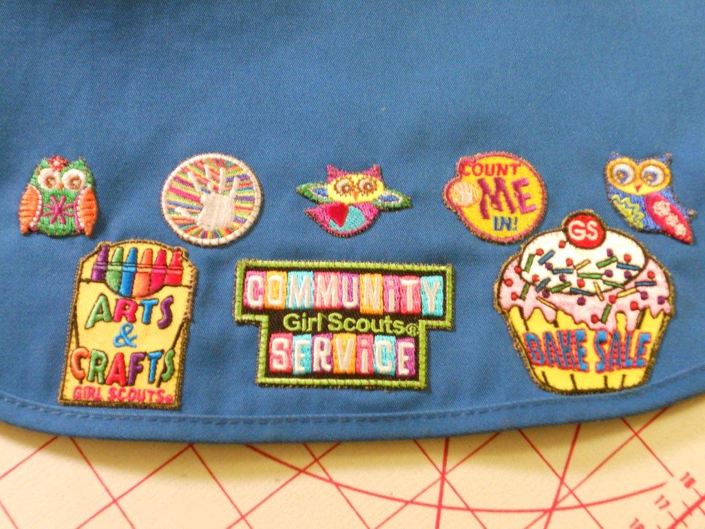 I still don't have the sales sheet to know who gets what type, I'll get that sheet Monday night - but David did bring home her badges that she earned for selling over 140 boxes - the little owls, aren't they cute? I sewed them onto the back of her tunic along with some other fun badges she's already earned this year. I also sewed the center of her Daisy flower onto the front of her uniform for memorizing the Girl Scout Promise. :)